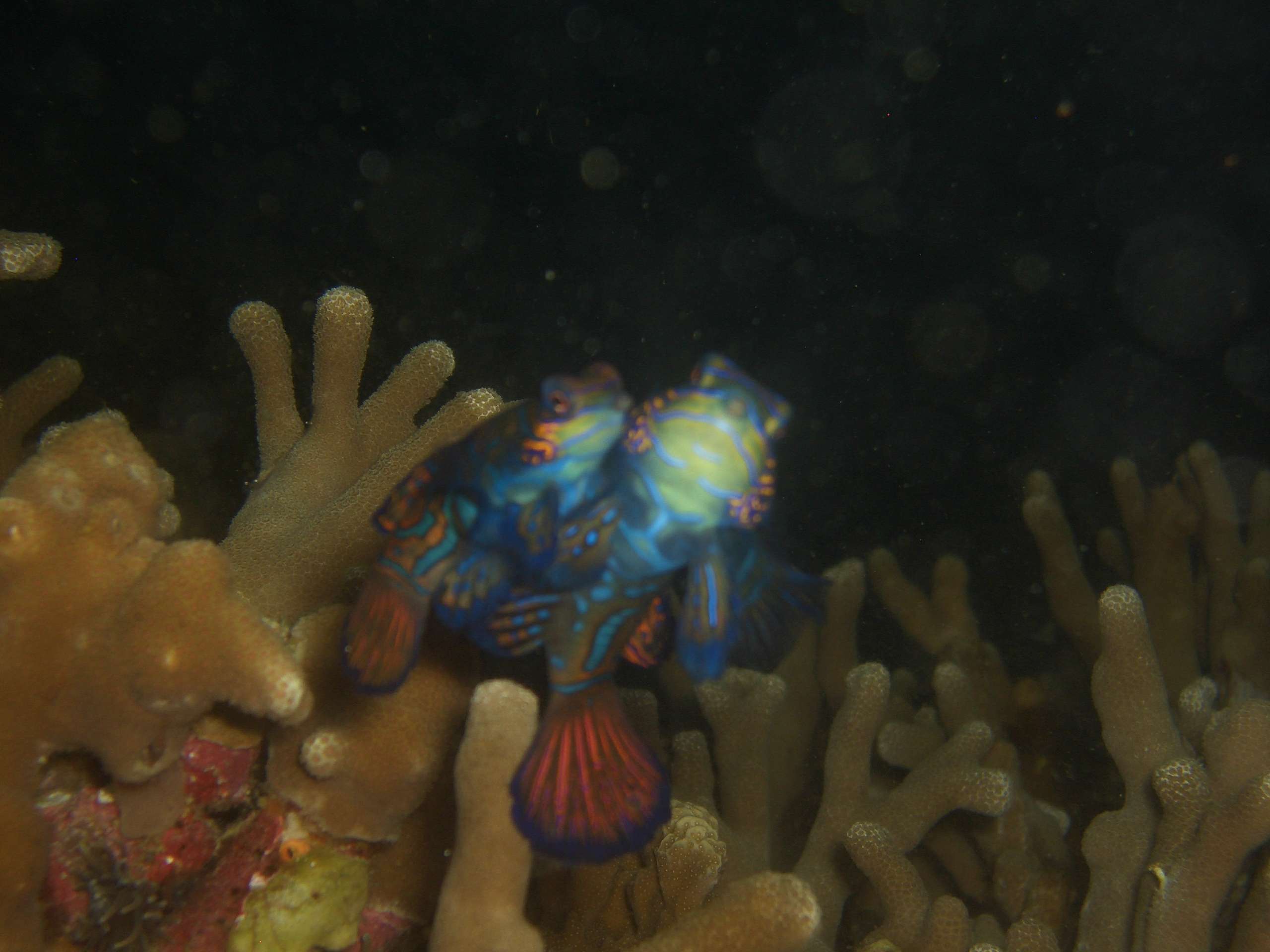 Takim sposobem zająłem jego pokój a reszta filipińskiej rodziny spała na ławeczce pod gołym niebem, co jak zauważyłem nie było dla nich niczym niezwykłym. Trochę dziwnie się z tym czułem, leżąc w umeblowanym pokoju z rodzinnymi zdjęciami na ścianach. Mimo to potrzebowałem mety na pierwszą noc. Zostawiłem graty i zająłem się najważniejszym. Szukaniem najtańszej bazy nurkowej. Tak się złożyło, że znalazłem przyzwoite nury za 1300peso i jeszcze tego samego dnia siedziałem na łodzi w towarzystwie polskiego turysty, który żyje żeby nurkować i podróżować po świecie (jak się później okazało). Czekaliśmy na zmrok by zaliczyć nocne nurkowanie na rafie koło wyspy. Zeszliśmy na 14 metrów latarką oświetlałem rafę. Główną atrakcją było znalezienie ryby zwanej Mandaryn Fish. Malutkiej ale pięknie ubarwionej a do tego strasznie płochliwej. Mieliśmy farta bo znaleźliśmy dwie.