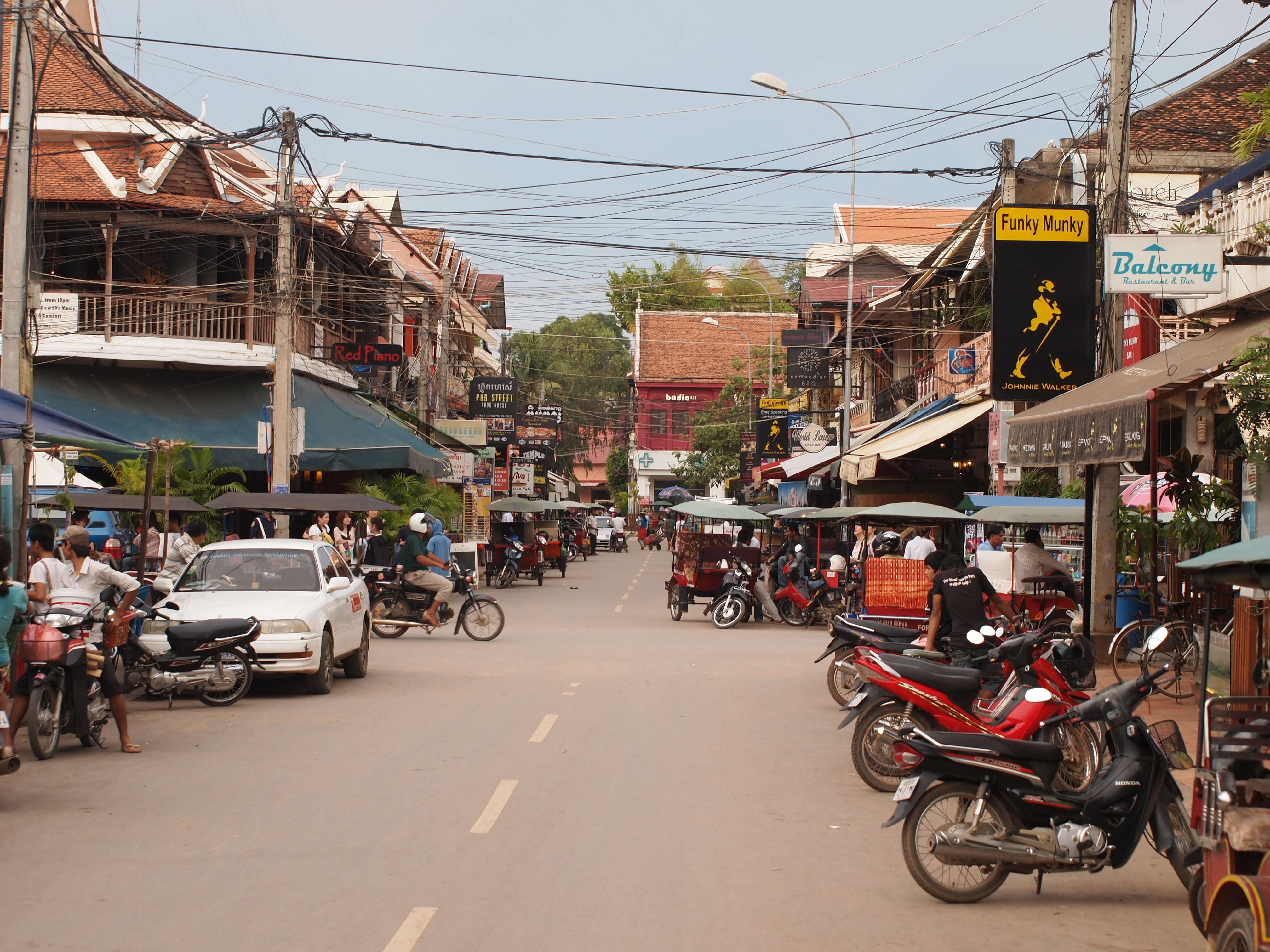 Same miasto jest bardzo zadbane. Skoszone trawniki, nie ma śmieci na ulicach i chodnikach a budynki, nie są walącymi się ruinami krytymi blachą falistą. Statystycznie na jednego turystę, przypada tutaj kilkanaście tuktuków – pojazdów ciągniętych przez skuter coś na wzór rikszy i na każdym kroku jest się zaczepianym przez kierowców tuktuków co jest męczące w pewnym momencie. Kiedy nie ma w okolicy tuktuka, nie wiadomo skąd pojawiają się dzieciaki sprzedające kartki pocztowe albo bransolety wykonane z bambusa. A zatem odganiając się od dzieciaków i kierowców tuktuk, swoje pierwsze kroki skierowałem ku wypożyczalni rowerów.
