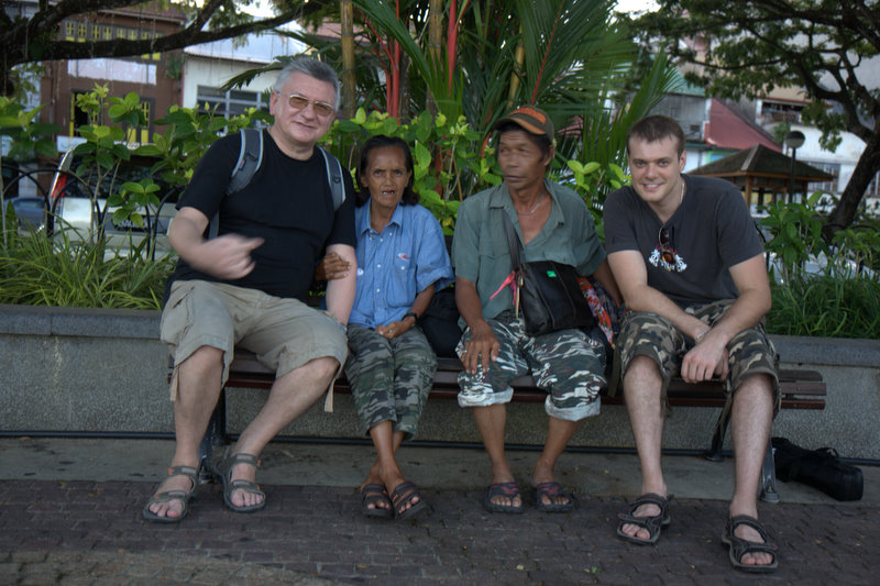 Okazało się że na Borneo, ludzie już jakiś czas temu zeszli z drzew i przesiedli się do samochodów z klimatyzacją. Zostawiając na drzewach orangutany. Pierwszego dnia w zasadzie nic się nie działo pospacerowaliśmy sobie po Kuching. Zjedliśmy kolację z owoców morza i udaliśmy się powrotem na konsumpcję Whiskey przywiezionej jeszcze z Londynu. Mnie na drugi dzień oprócz kaca męczył ból gardła i stan podgorączkowy – rezultat klimatyzacji na lotniskach i w samolocie. Lekko zdycham ale przeżyję. Reszta grupy ma się dobrze. Z rana przywitały nas grube chmury, ale mimo to jedziemy poszukać w dżungli orangutanów – w końcu po to tutaj jesteśmy. O tej porze roku jest to bardzo trudne, ponieważ w dżungli jest sporo owoców i orangutany trzymają się zdala od ludzi. Mimo to mieliśmy farta i udało nam się spotkać małą rodzinkę mamę, tatę i małego orangutanka. Zwabiło ich mleko w butelce trzymane przez przewodnika. Niesamowity widok. To był nasz pierwszy kontakt z dzikimi zwierzętami stojącymi na wyższym szczeblu ewolucji niż gekony zapierdzielające wszędzie po ścianach jak karaluchy w Nowym Jorku 🙂
