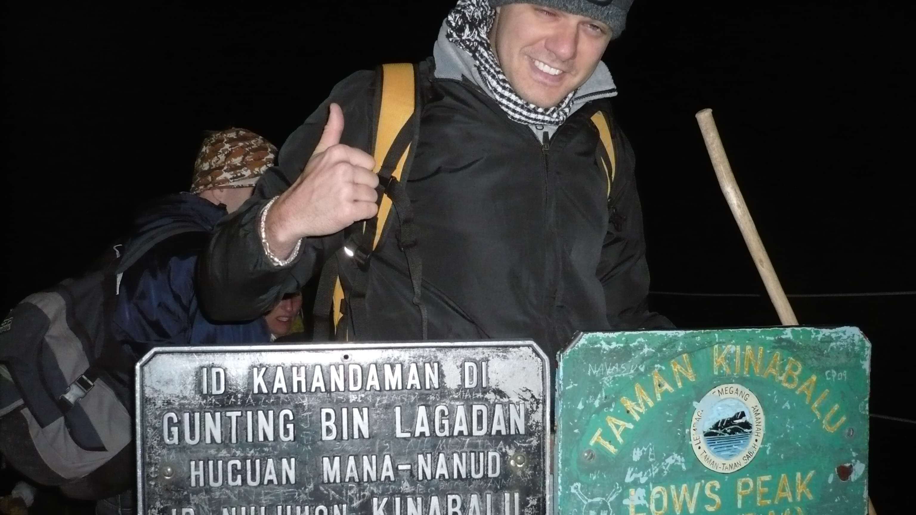 Po mozolnej wspinaczce wreszcie dobrnęliśmy do szczytu najwyższej góry Borneo. Zostało tylko 50m wśród spękanych skał. Chwytając się czego się dało w pół śnie i zmęczeniu postawiliśmy swoje kończyny na szczycie.Za nami wspiął się nasz przewodnik, który zrobił sobie przerwę na fajkę. Nie mam pojęcia jak ten gościu mógł wspiąć się tak wysoko i popalać jak by wjechał tu ruchomymi schodami. Znaleźliśmy się tam w sam czas żeby obejrzeć wschód słońca nad Borneo. Wschód słońca z tej perspektywy ma w sobie coś mistycznego. Oczy wszystkich ludzi którzy wspinali się w tym samym czasie zwrócone były w tym samym kierunku. To jest widok, którego nigdy się nie zapomni, a dzięki okupowi zmęczenia obraz ten jest wiecznie żywy. Po chwili spędzonej na szczycie zaczęliśmy zejście. Zejście ze szczytu do schroniska, jest najprzyjemniejszą częścią wspinaczki po za widokiem ze szczytu. Nie jest trudne, ale najgorsze było przed nami. Ja zafundowałem sobie krótką drzemkę w schronisku w czasie kiedy Marcin P. poszedł coś przetrącić na stołówce. Kiedy wrócił, ja byłem totalnie rozłożony chorobą. Wysoka gorączka, nudności zero możliwości skupienia się na jakimkolwiek zadaniu. Choroba wysokościowa dopadła mnie z siłą domestosa. Mimo to przemocą zaciągnął mnie żebym coś zjadł zanim zaczniemy zejście. Ponoć wyglądałem jak duch