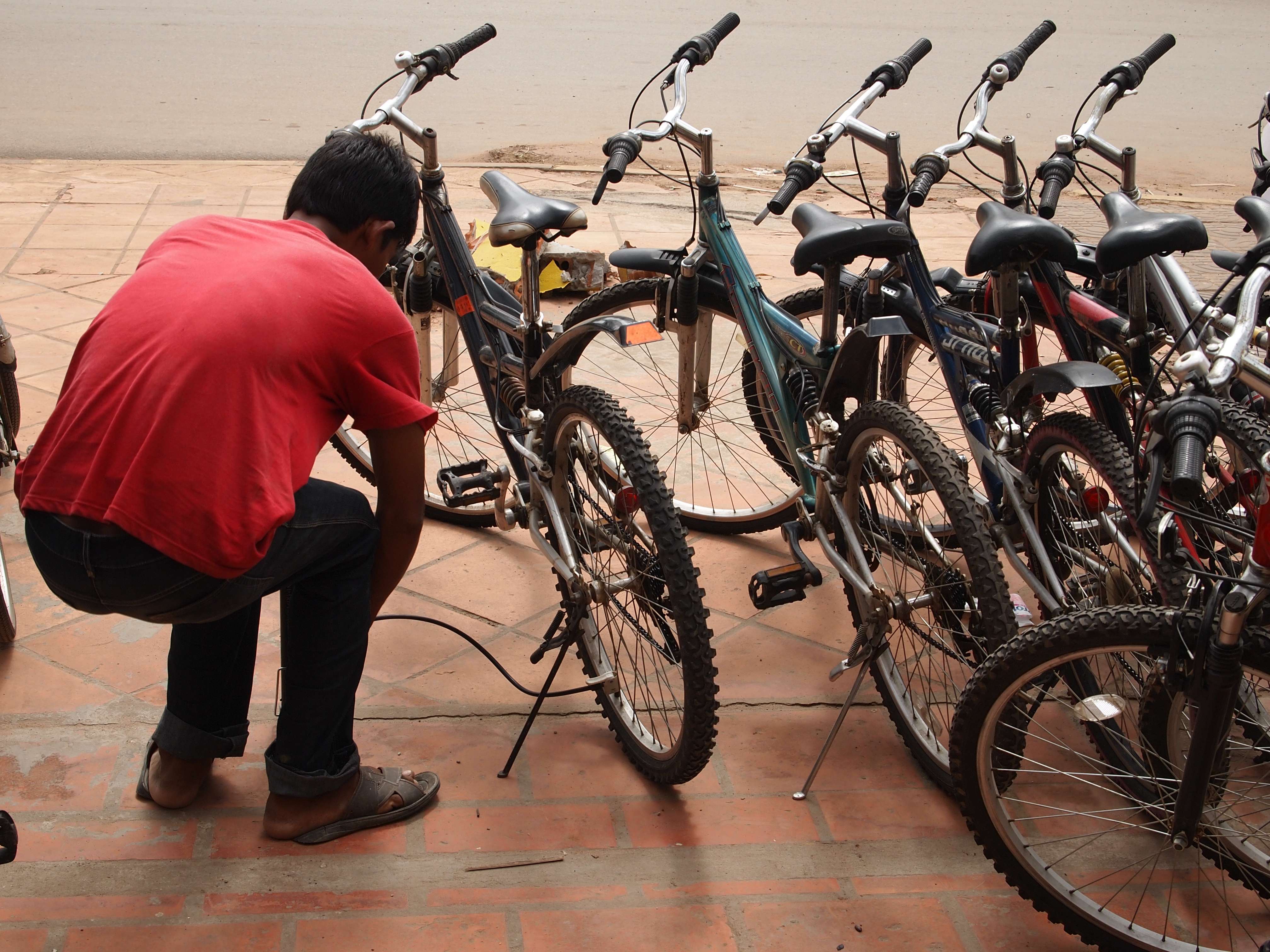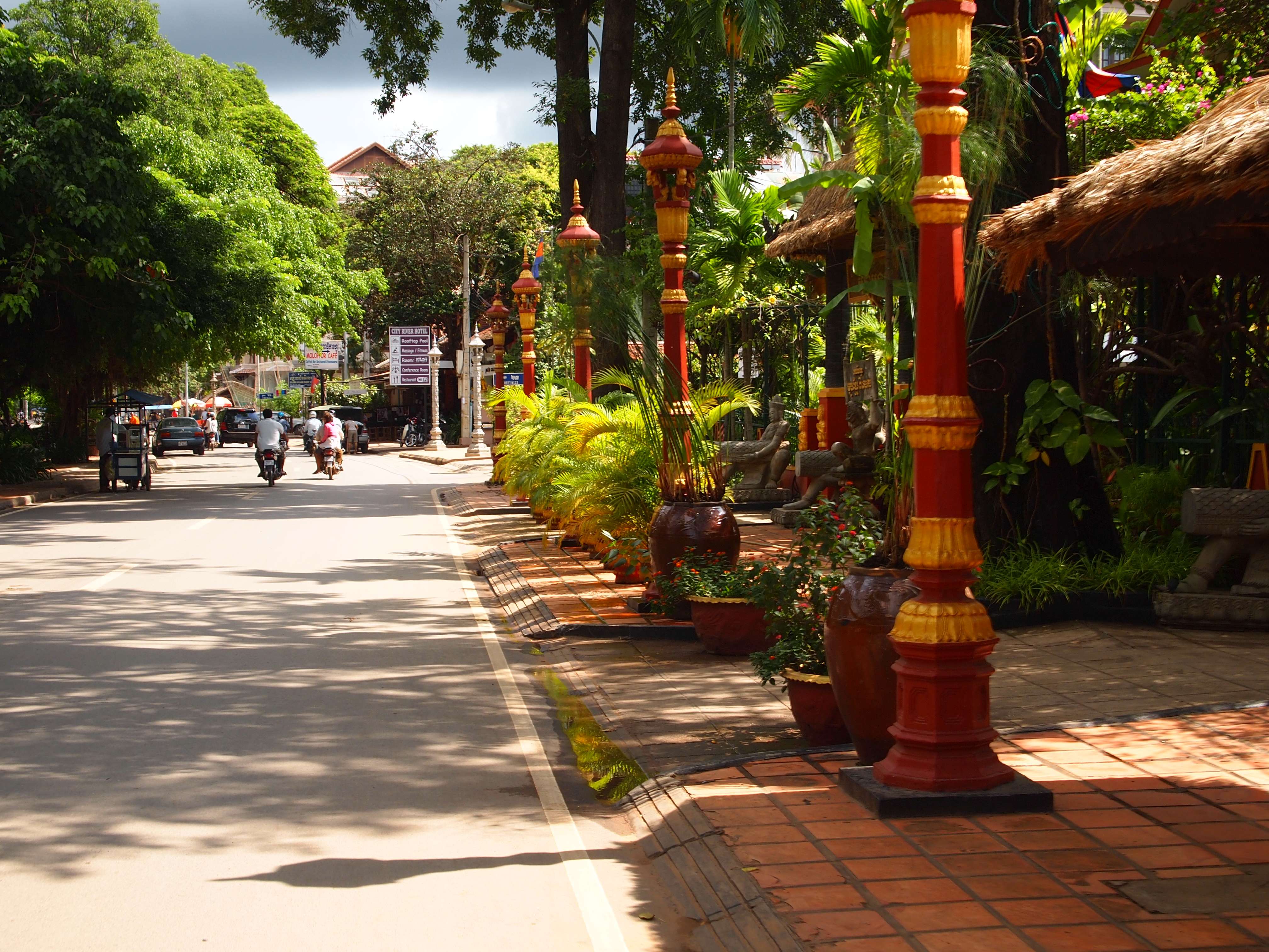 Same miasto jest bardzo zadbane. Skoszone trawniki, nie ma śmieci na ulicach i chodnikach a budynki, nie są walącymi się ruinami krytymi blachą falistą. Statystycznie na jednego turystę, przypada tutaj kilkanaście tuktuków – pojazdów ciągniętych przez skuter coś na wzór rikszy i na każdym kroku jest się zaczepianym przez kierowców tuktuków co jest męczące w pewnym momencie. Kiedy nie ma w okolicy tuktuka, nie wiadomo skąd pojawiają się dzieciaki sprzedające kartki pocztowe albo bransolety wykonane z bambusa. A zatem odganiając się od dzieciaków i kierowców tuktuk, swoje pierwsze kroki skierowałem ku wypożyczalni rowerów.